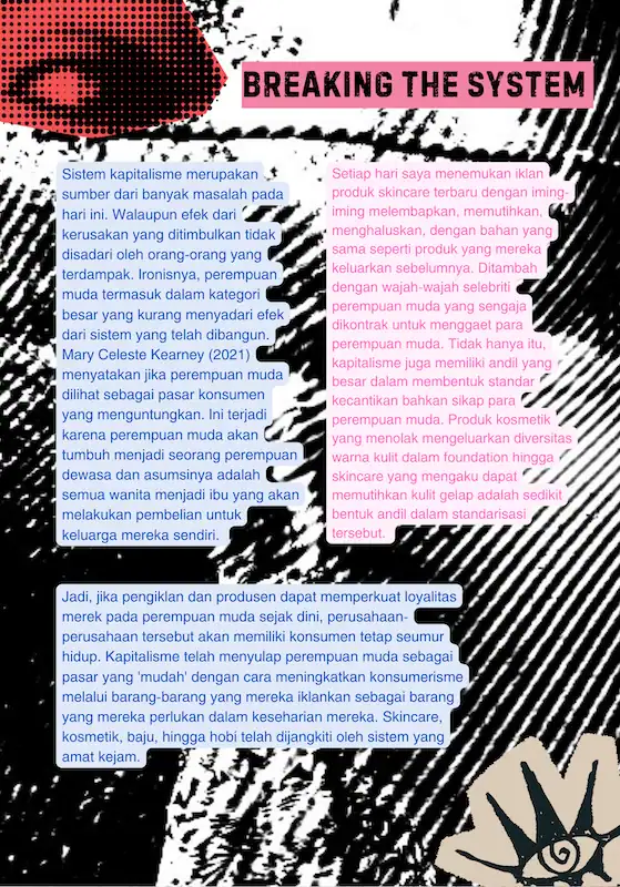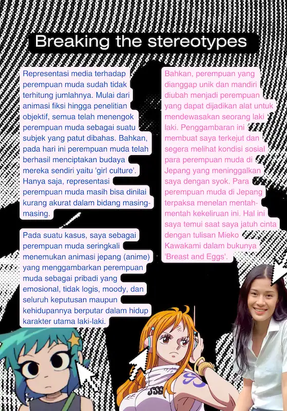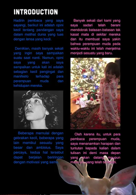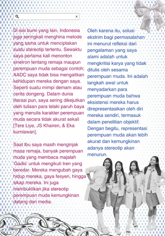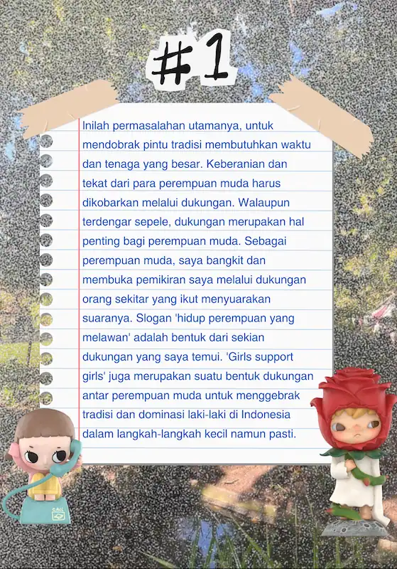 Indonesian Girls Against Boundaries adalah zine berisikan esai opini hasil dari refleksi penulis dalam diskusinya di Klub Perempuan Perempuan muda. Terdapat 3 bab penting yang merupakan refleksi kehidupan perempuan muda, kesimpulan masalah yang dihadapi perempuan muda hari ini, dan bagaimana kita sebagai perempuan muda menyelesaikannya
